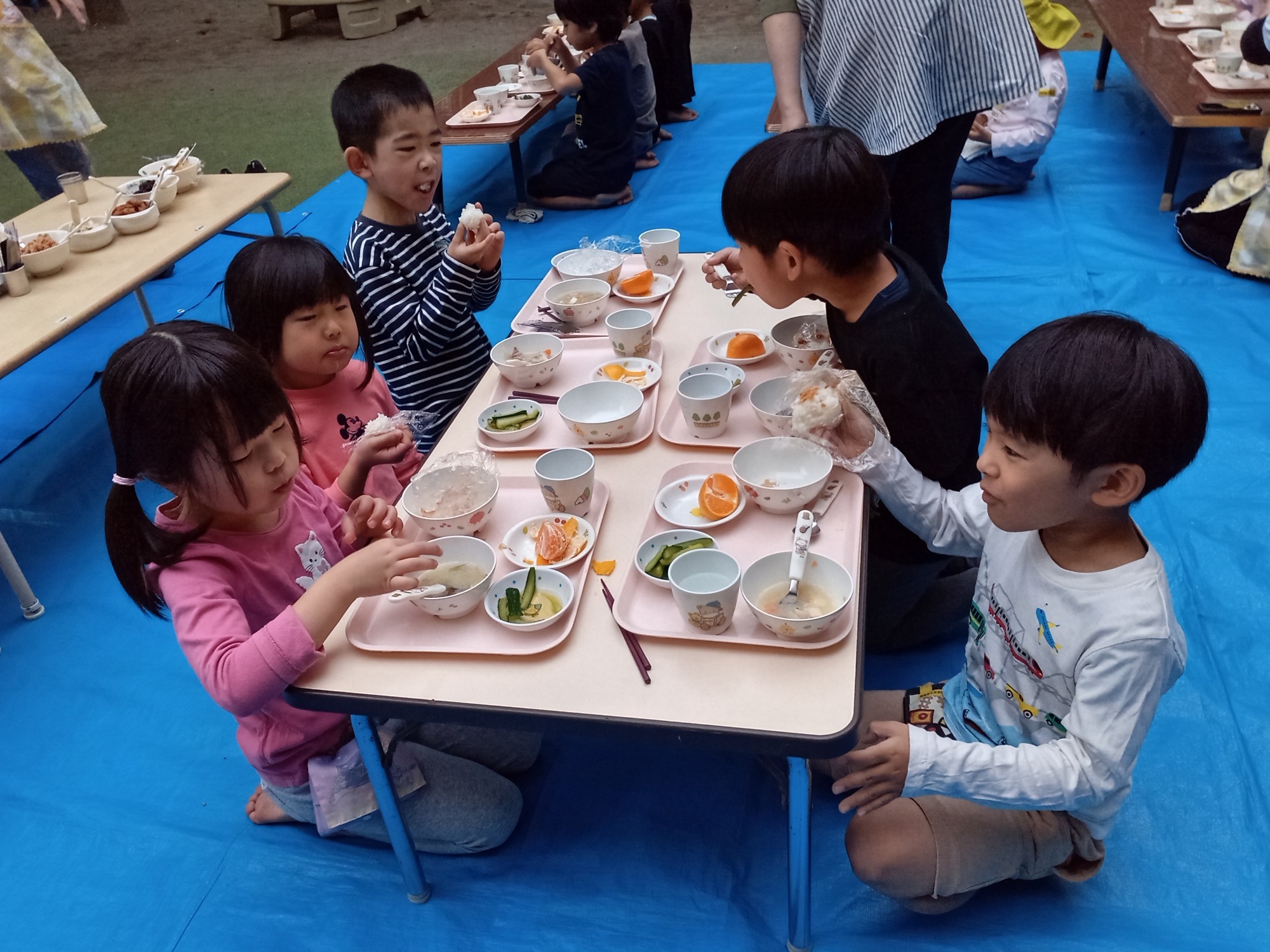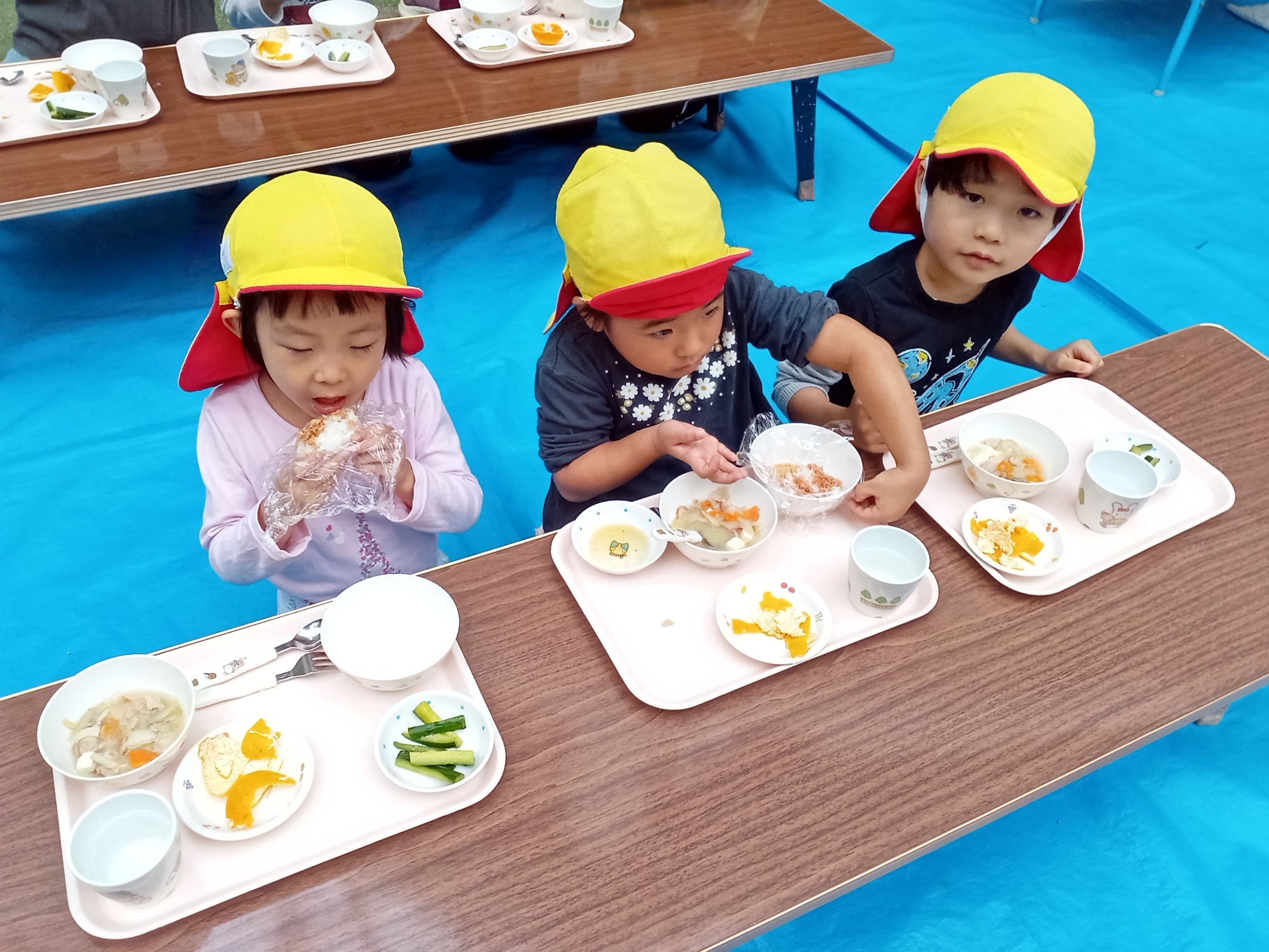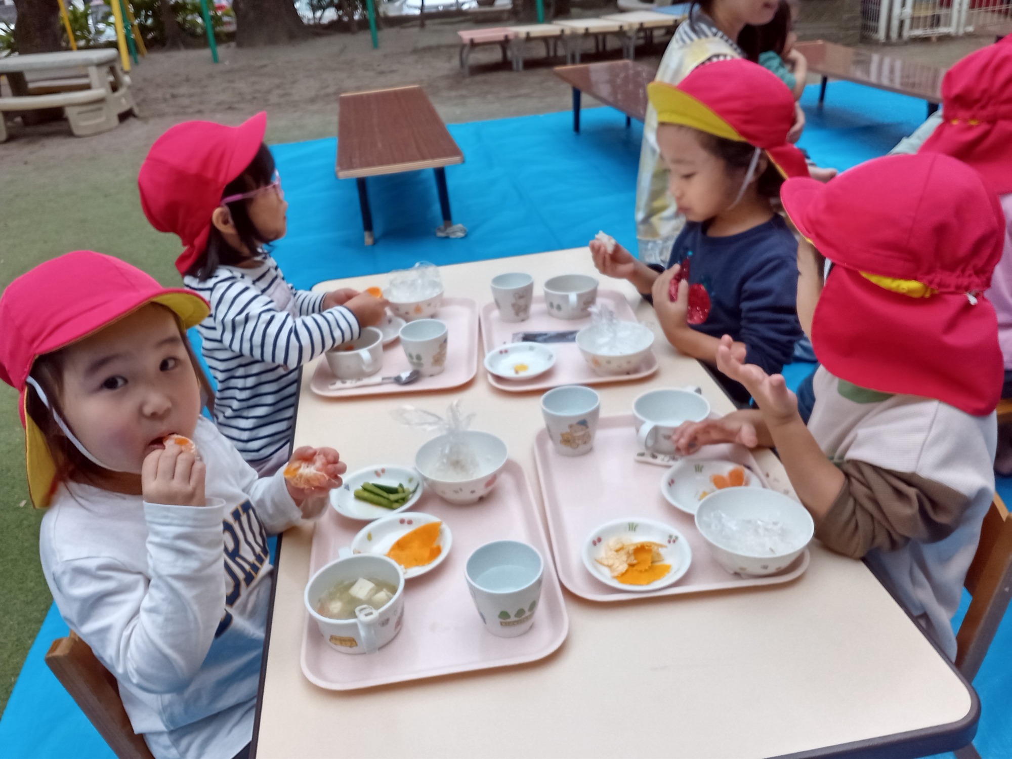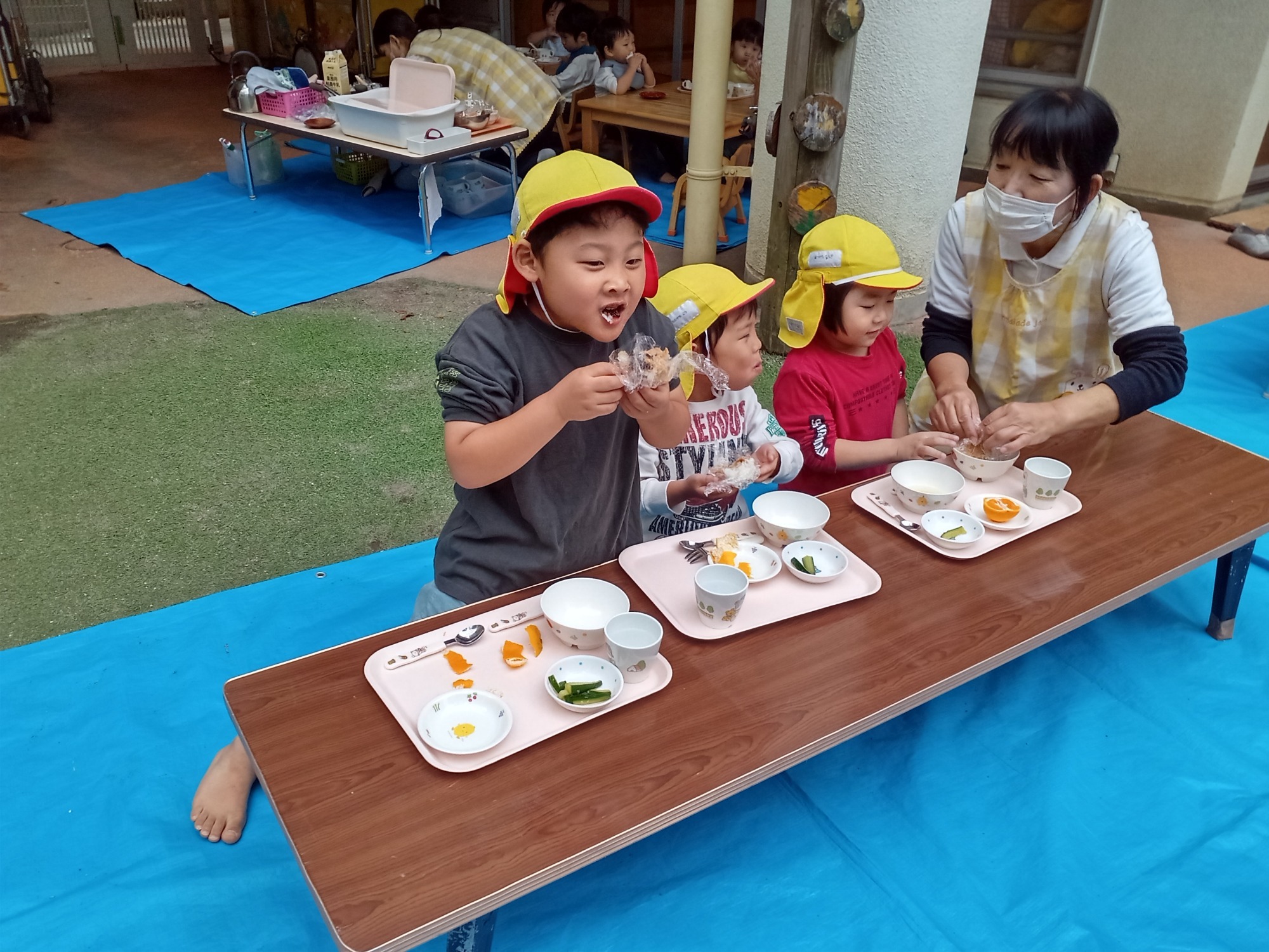 園庭でのお弁当ワクワクします