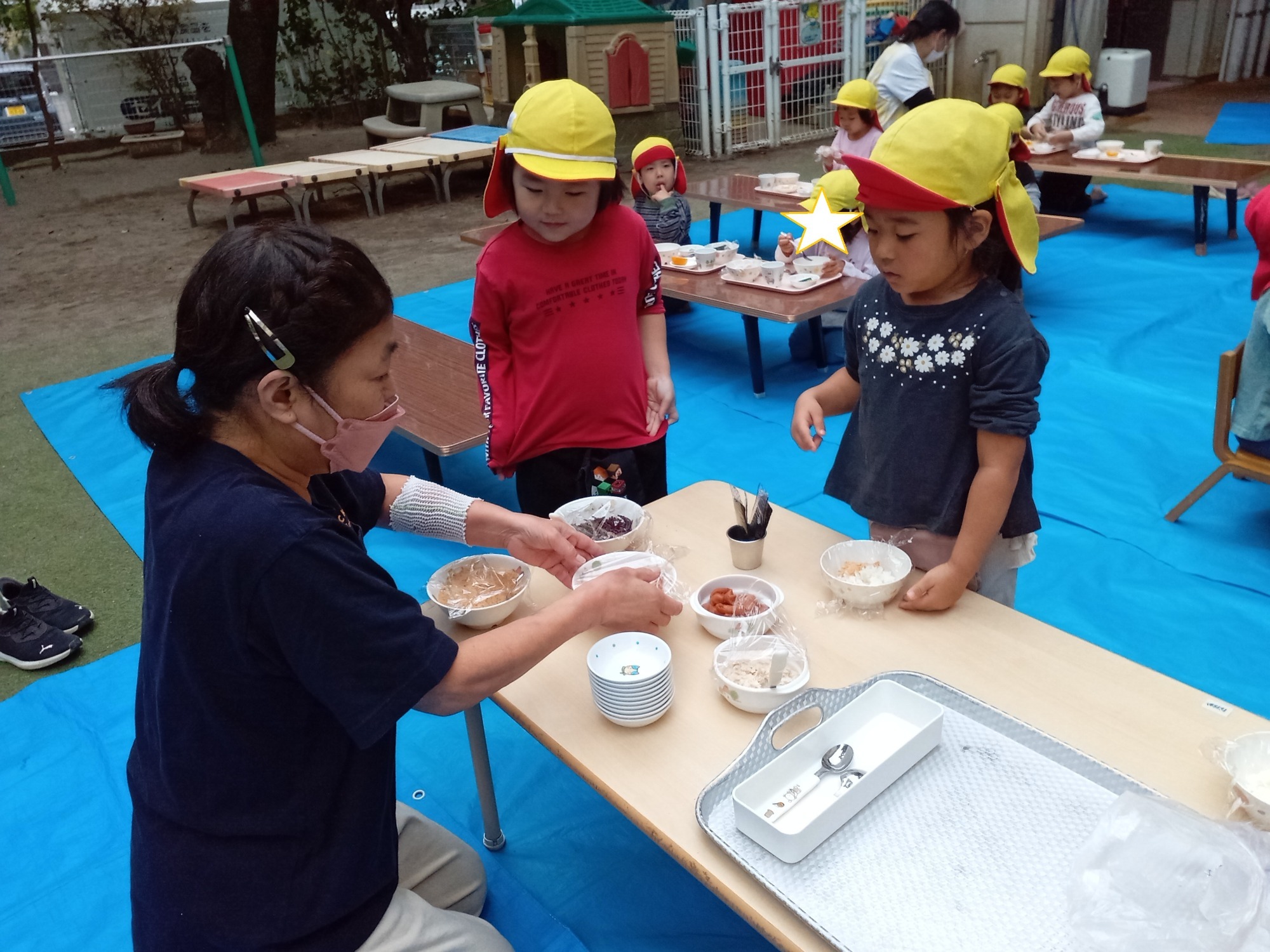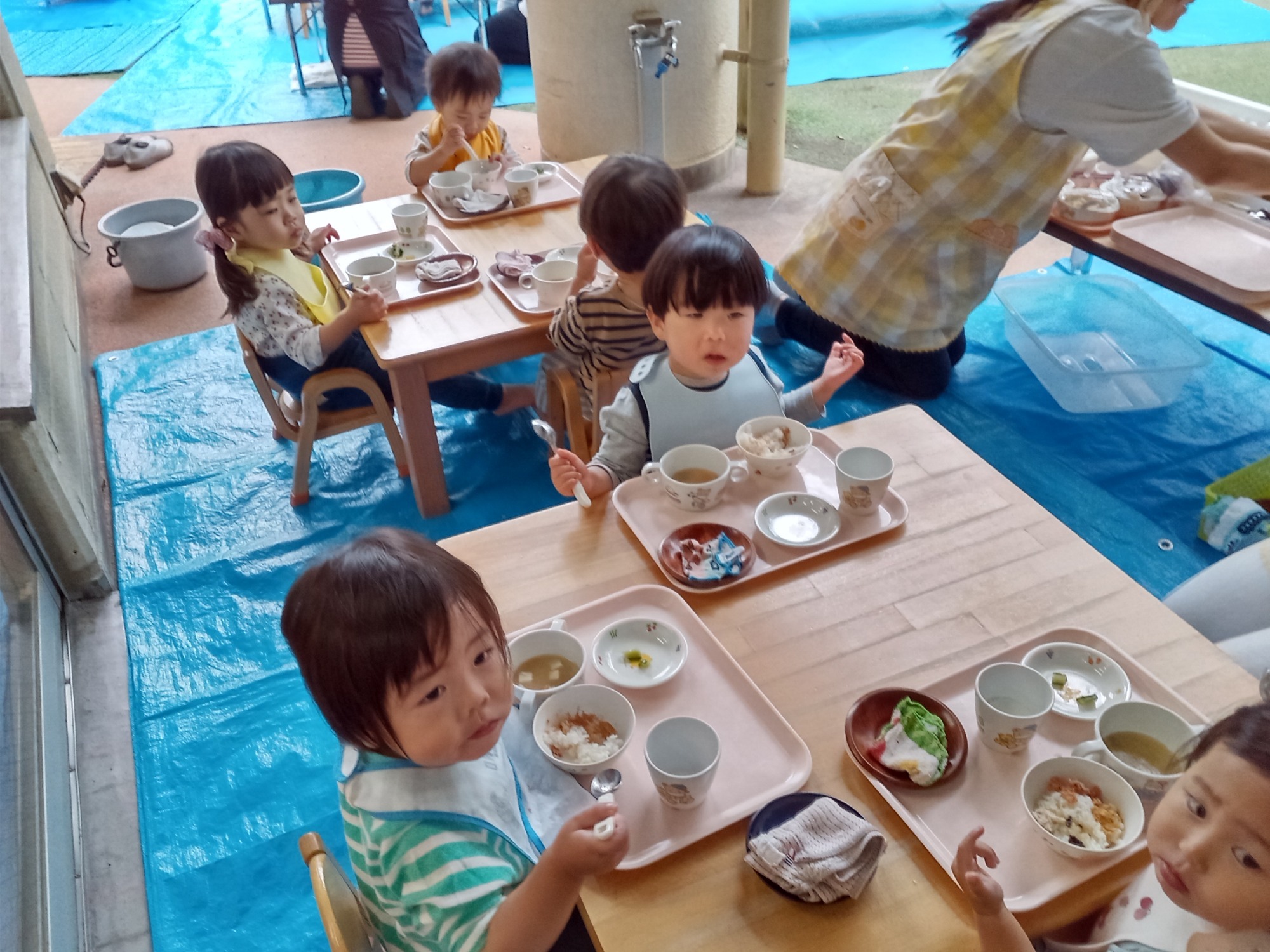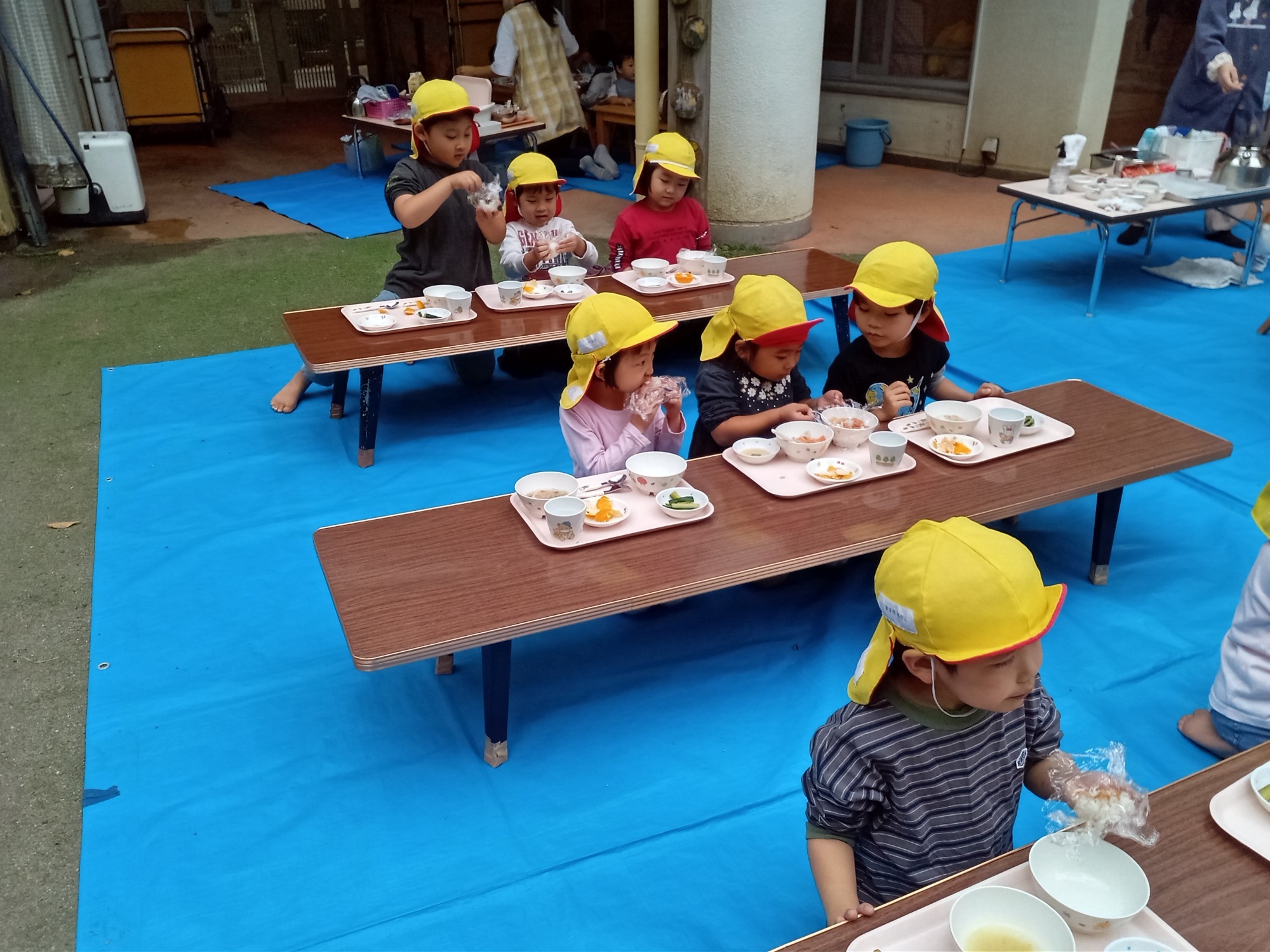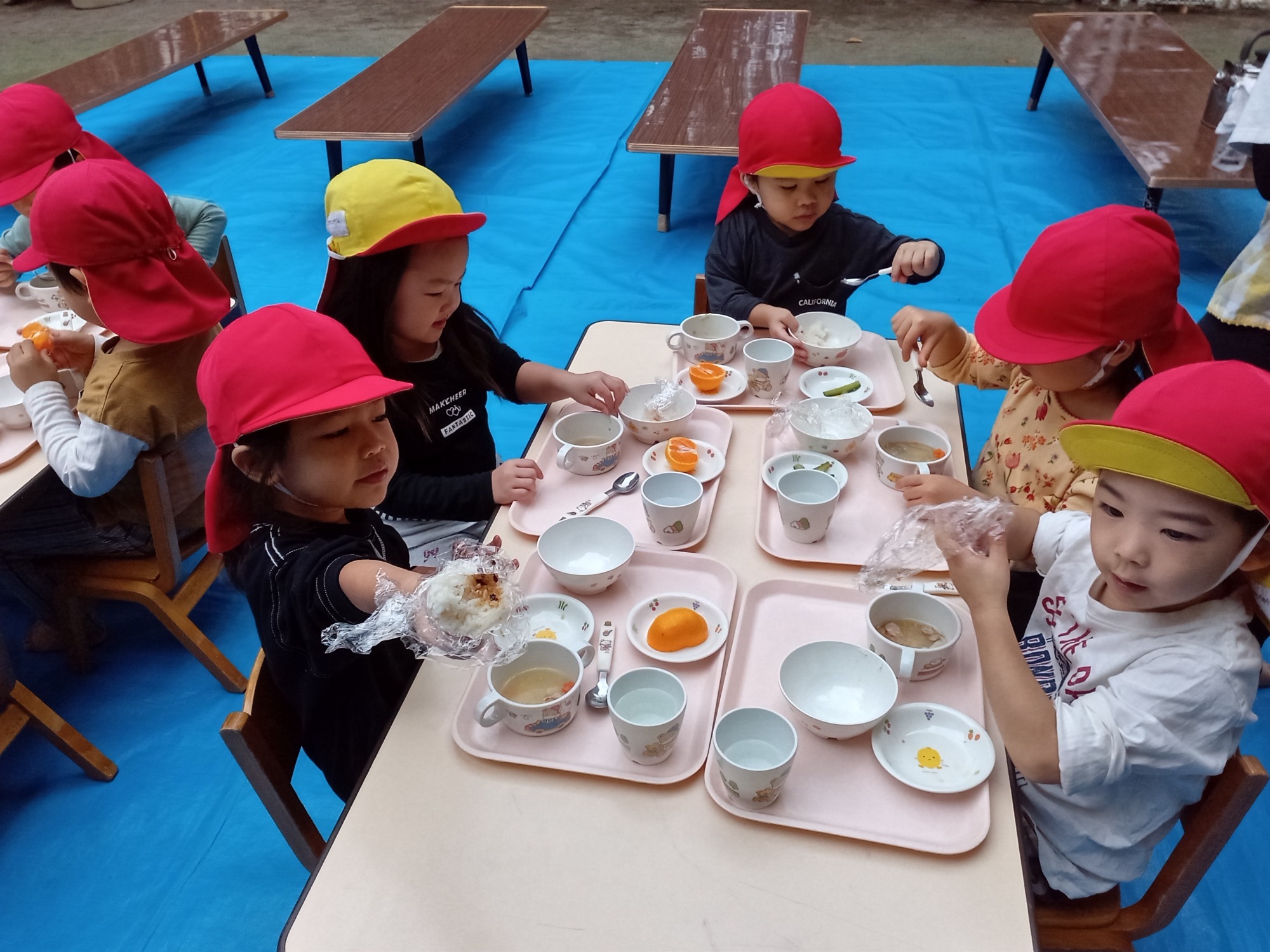 園庭でのお弁当ワクワクします