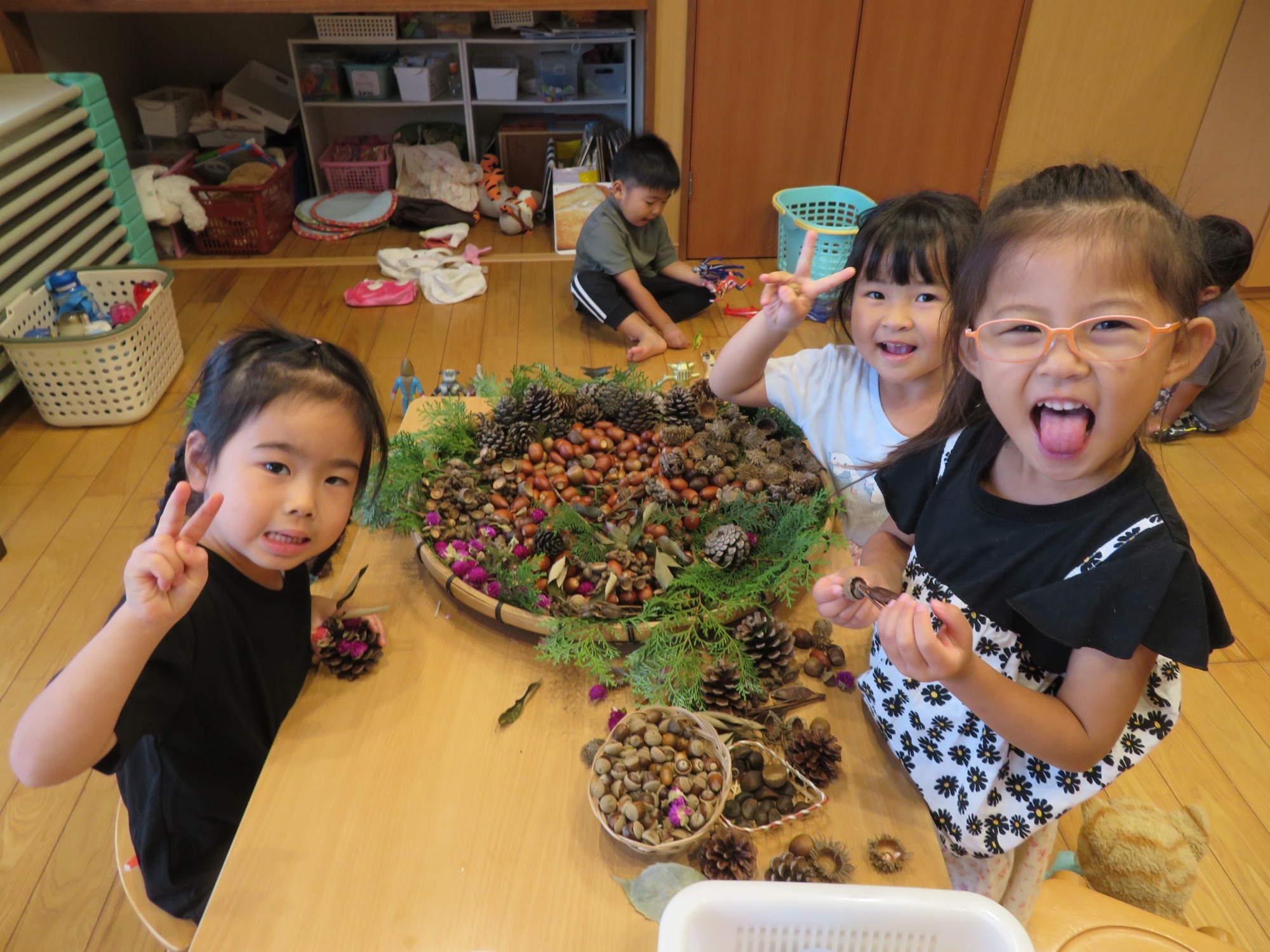 たくさんの木の実が集まりました。どんぐりもいろんな形があるね!