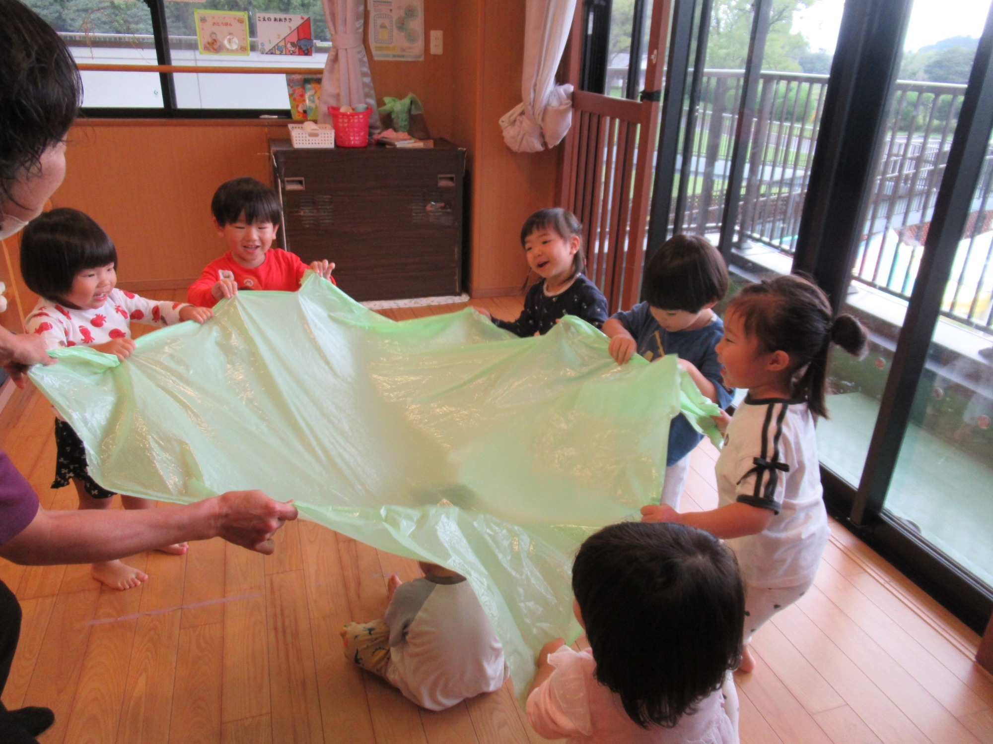 相信組(2歳児)さんが運動会ごっこ。バルーンを真似して楽しそうです。