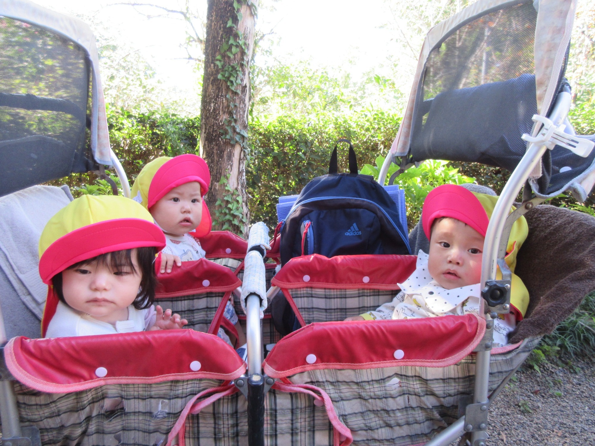 仁愛組(0歳児)さんも散歩車に乗って遠足に行きました。お外は気持ちいいね!