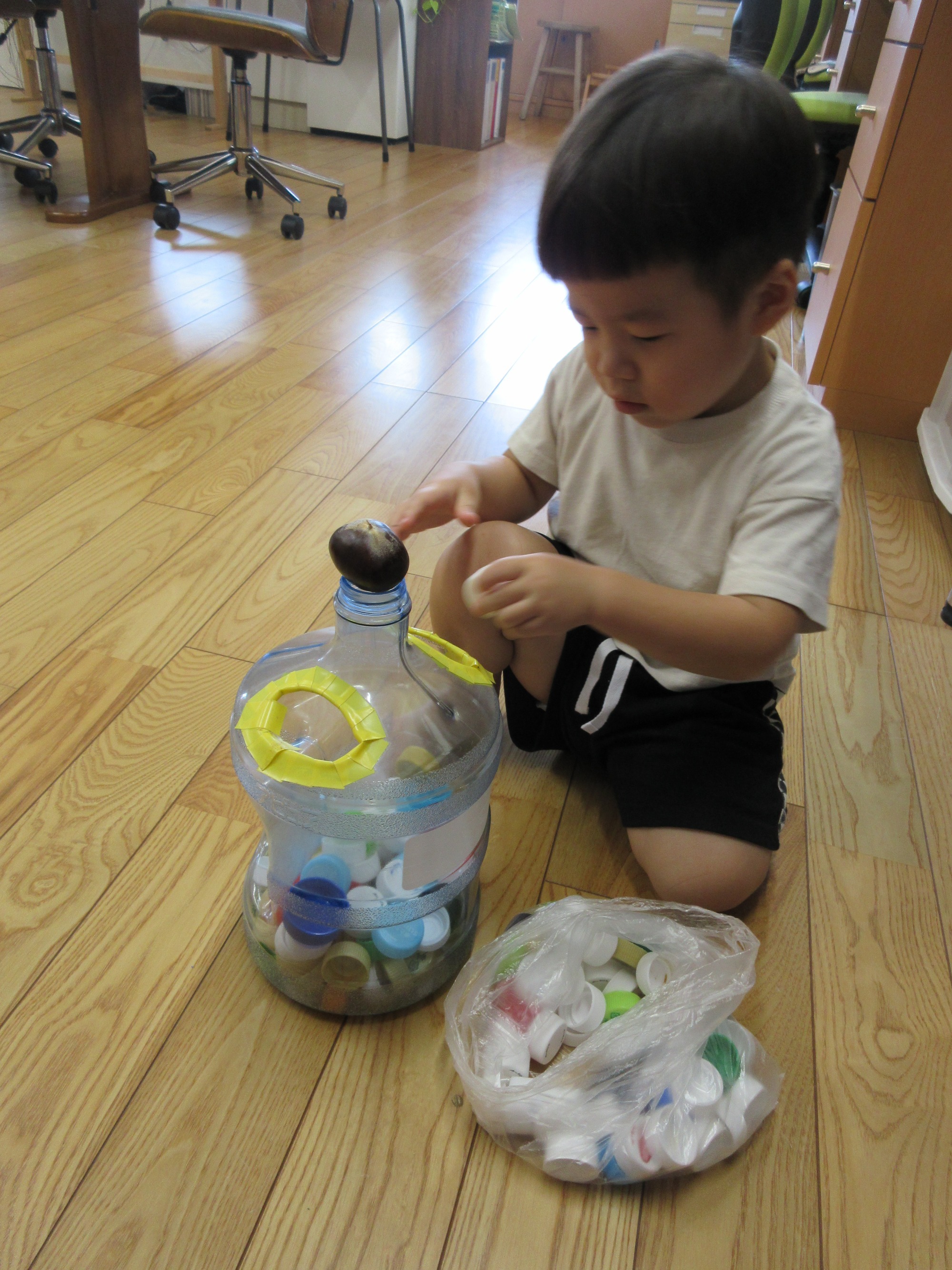 【エコキャップワクチン】ペットボトルキャップをお家から持ってきて回収ボックスに入れてくれました。沢山集めてワクチン購入費用として寄付します。