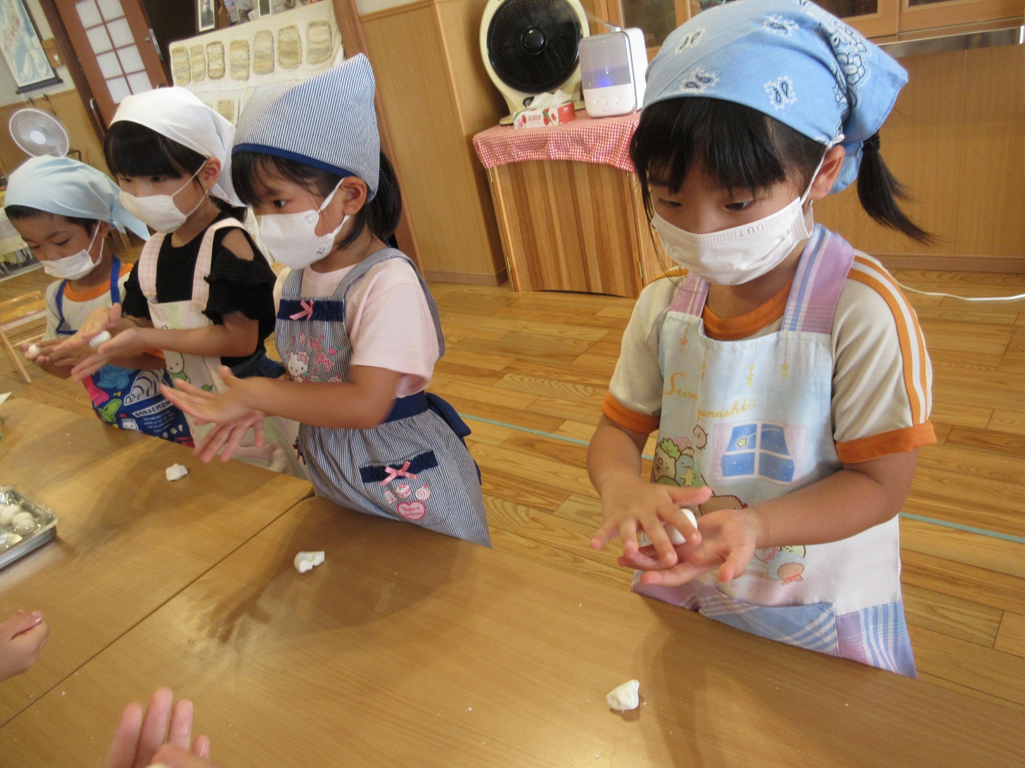 以上児は太平洋組(5歳児)さんが、小麦粉でお団子を作りお供えしました。丸めるのも上手です。