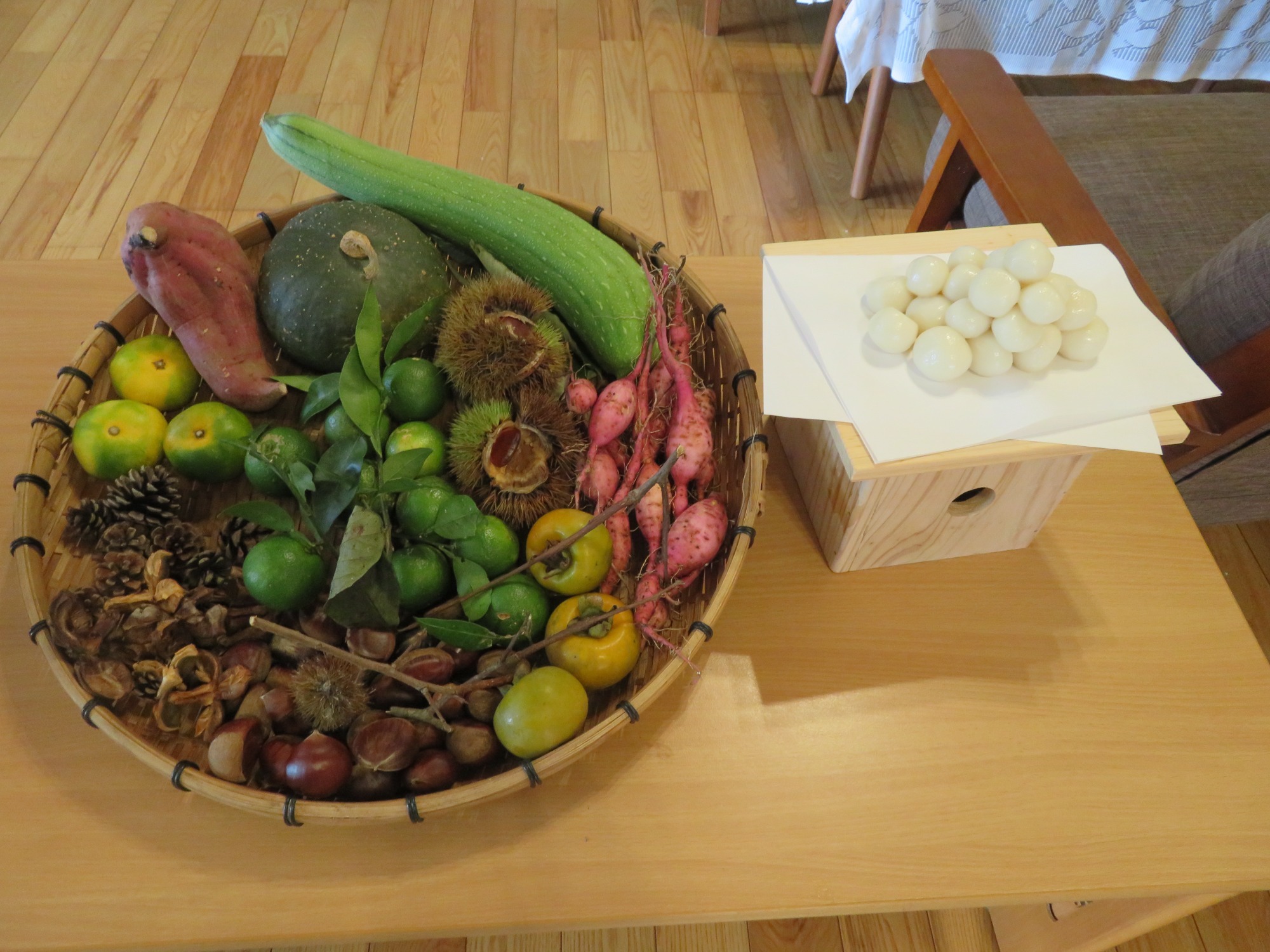 栗、柿、プランターで育てたさつま芋も収穫してお供えしました。