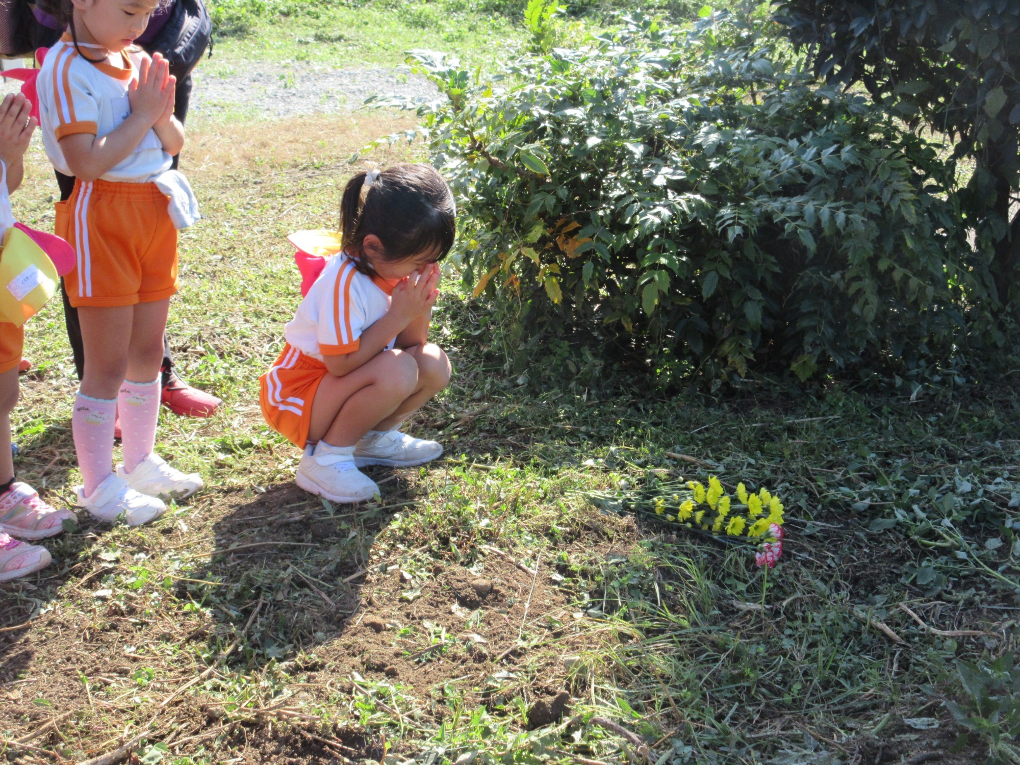 石井十次先生のお墓掃除の折や、散歩などで園児の家のお墓の前を通った時にお墓参りをしながら、先祖や両親、祖父母などがいたから今、ここに自分が存在しているだという事を、保育者の言葉で語ってあげることで、先祖や両親など周りの人への感謝と尊敬の気持ちが、子どもたちの心に積み重なっていくようにし、常に礼をつくせる子どもになる。