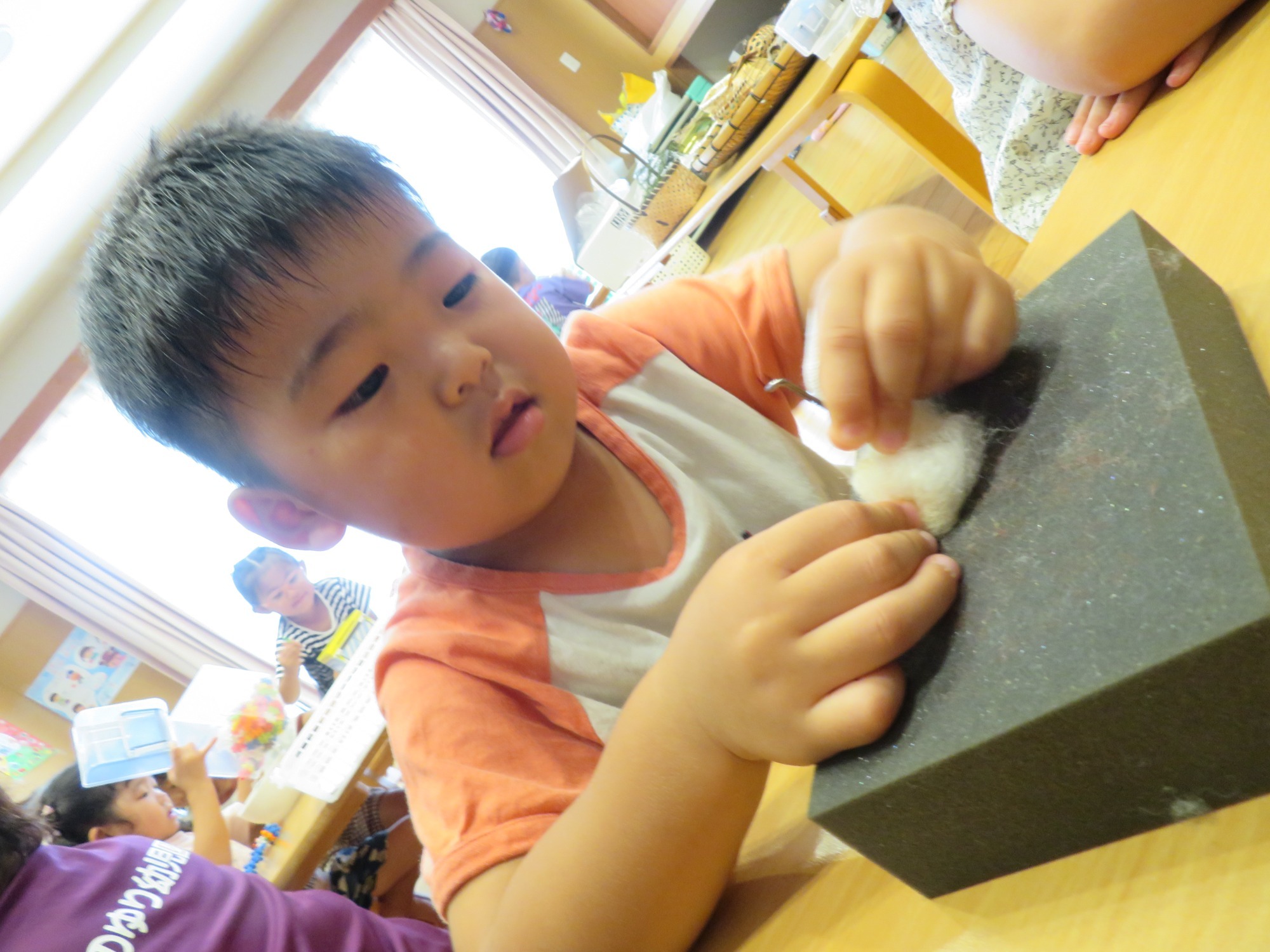 羊毛をニードルパンチで丸めています。羊毛はふわふわしてるね。