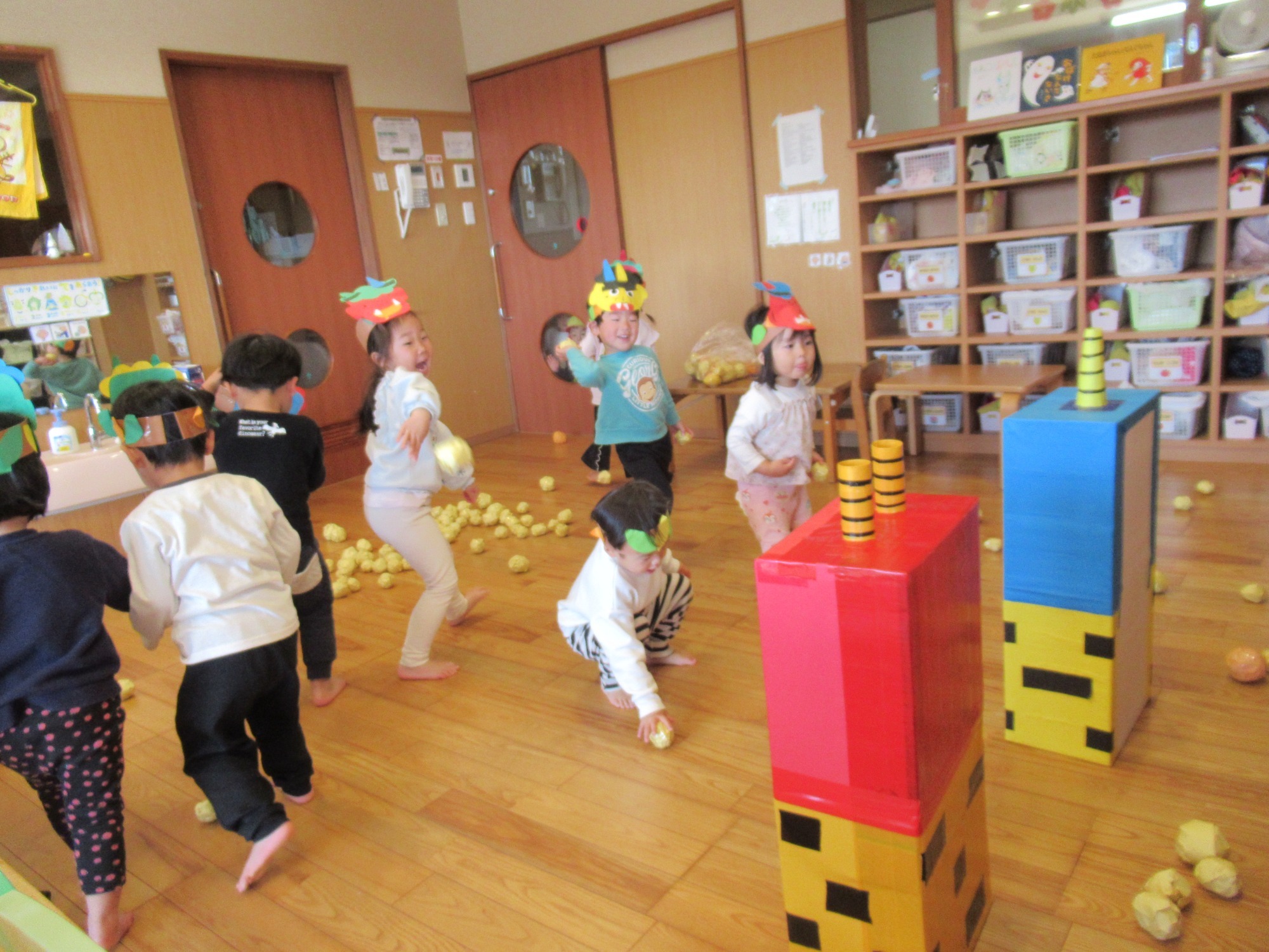 【節分】自分で作った鬼のお面をかぶり豆まきです。「おにはそと~ふくはうち~」