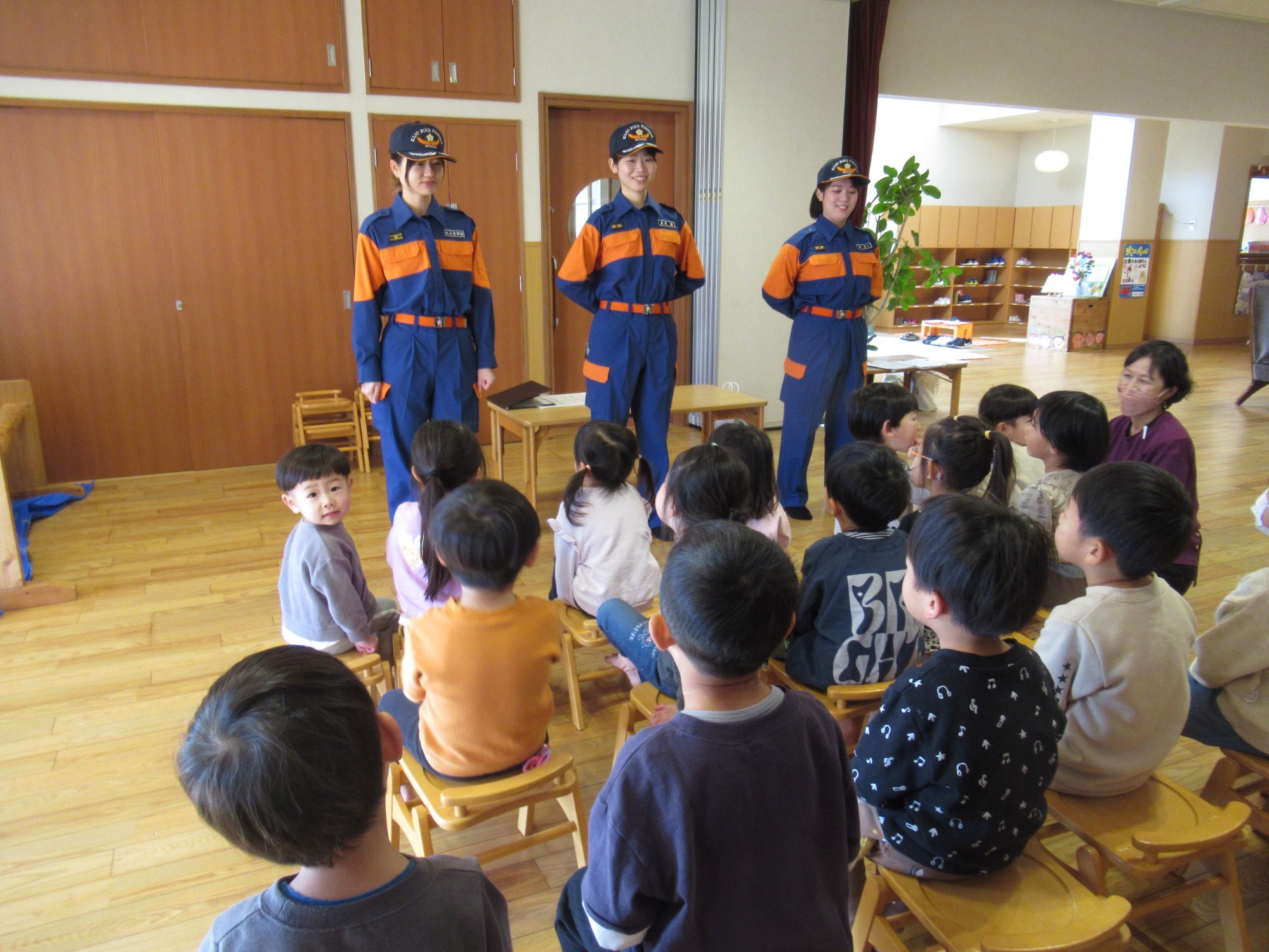 【木城町女性消防団来園】「地震が起きたら」をテーマに紙芝居で災害や避難の仕方について教えていただきました。ありがとうございました。