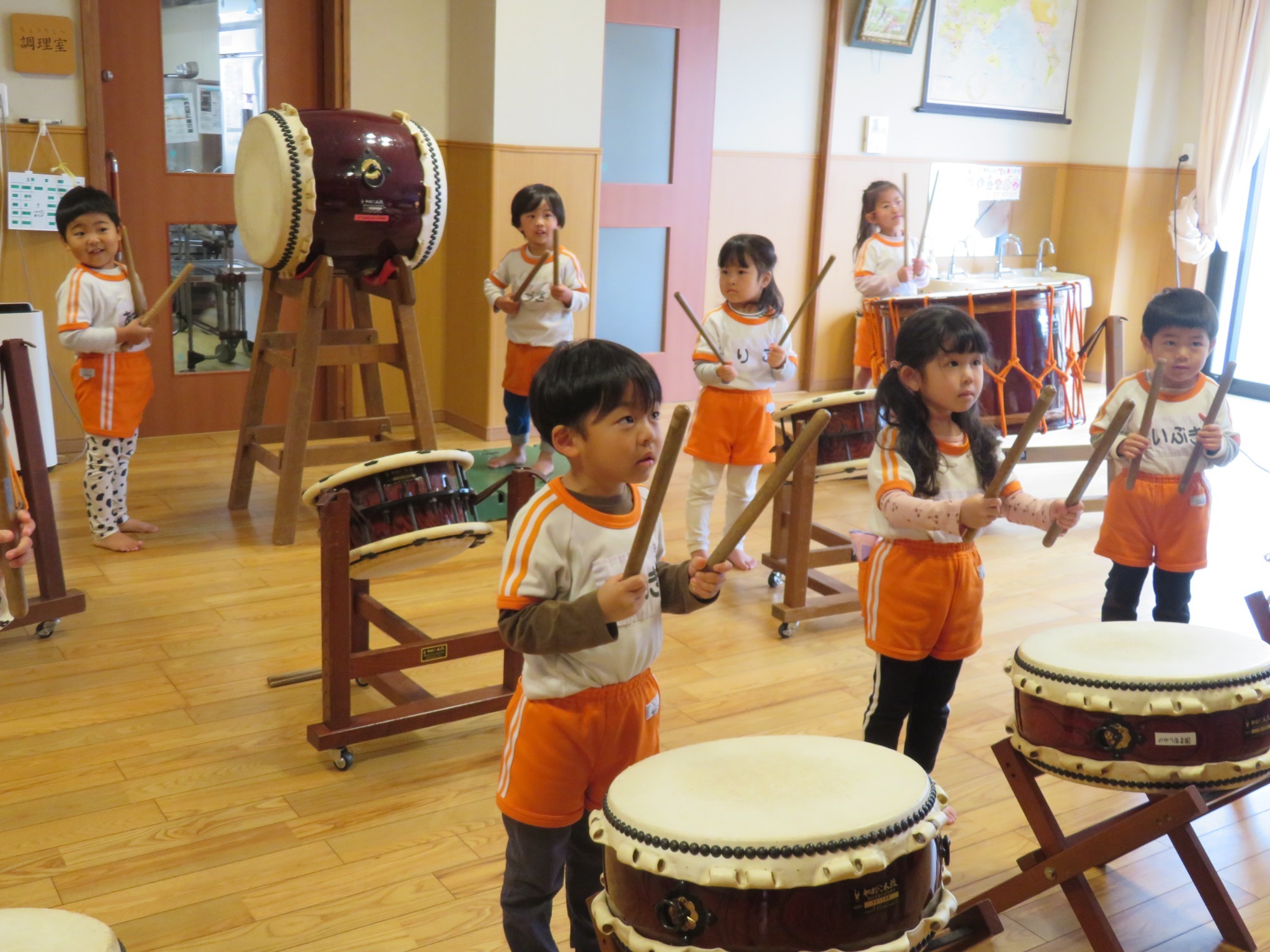和太鼓の取り組みは3,4,5歳児とし、「みんなで音楽を創る心」を大切にしながら子どもの無限の可能性を引き出し、本物の「音楽の感動」を体験できるようにする。