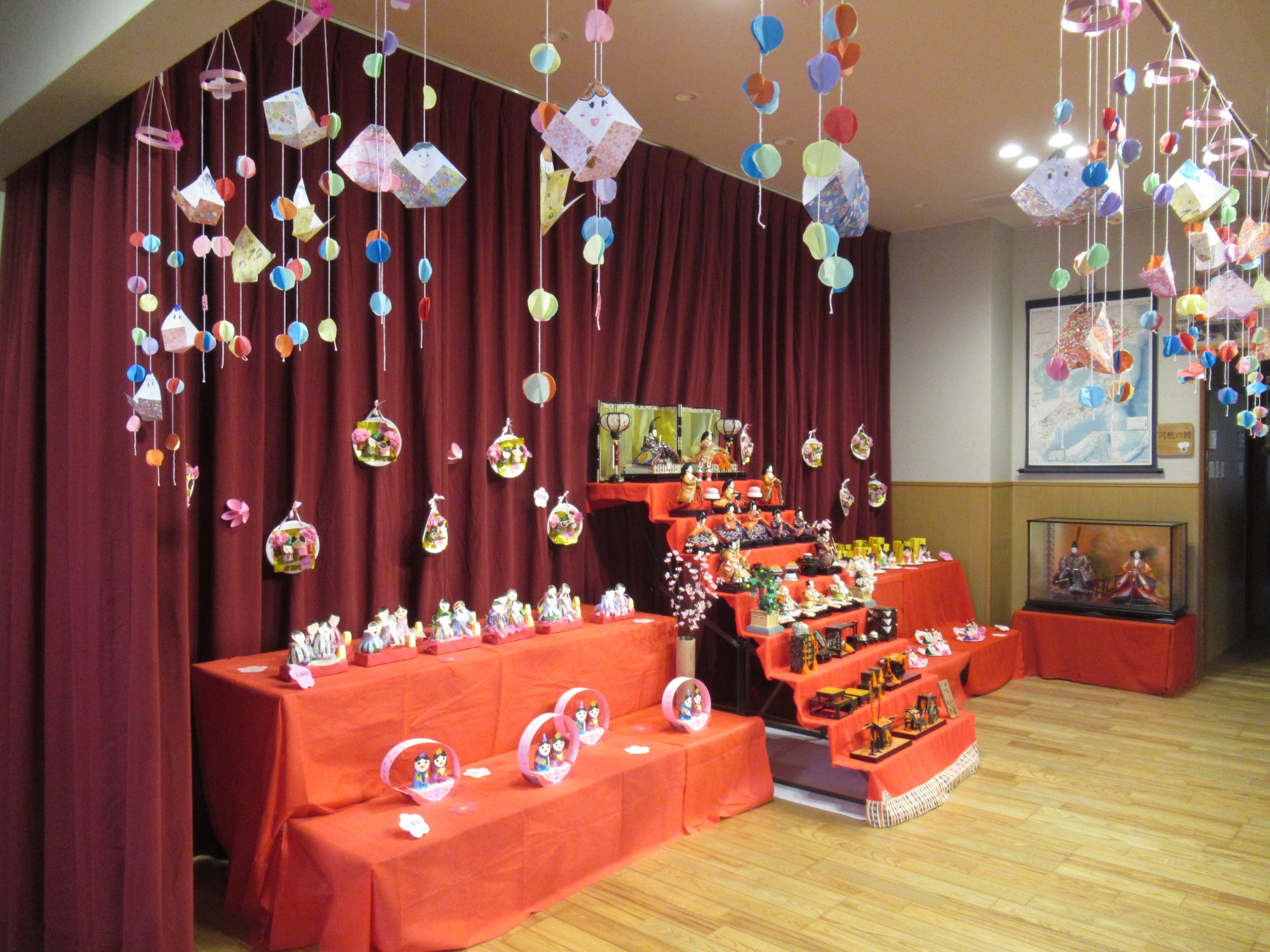 【ひなまつり】七段かざりと、こどもたちが作ったかわいいひな人形が明倫塾を華やかにしています。