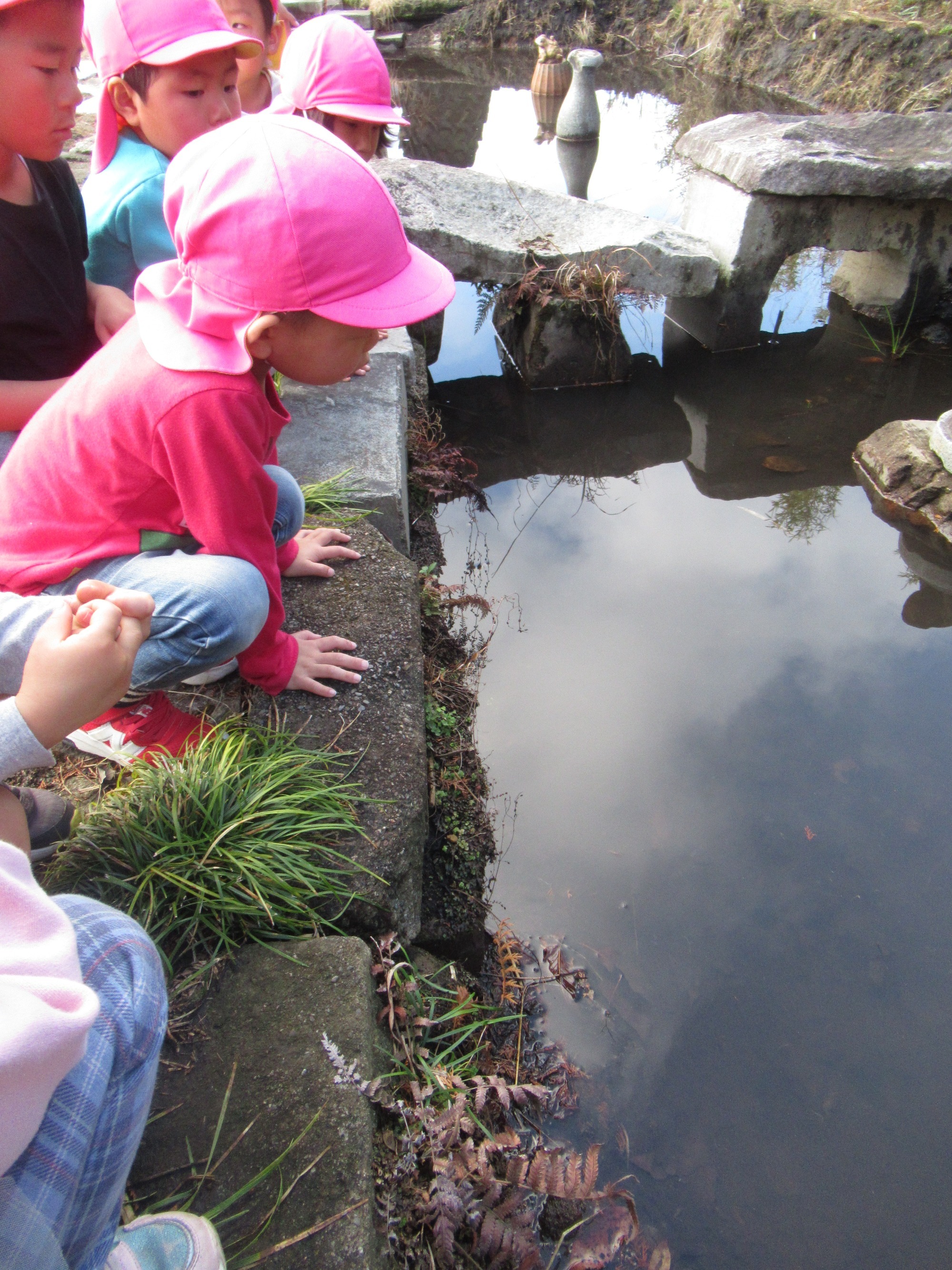 春を探しに散歩に出発!池の中をのぞくと…「かえるのたまご」を発見。「こっちにはカニもおるよ!」池の生き物をたくさん見つけました。